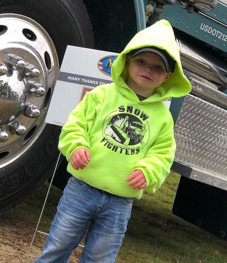 Kids Snow Fighters Snow Plow Hoodie 50/50 Cotton/Poly with Snow Fighters Big Rig Snow Plow Graphic on Front Sizes: XS, (2-4), S (6-8), M (10-12), L (14-16) Runs Small Colors: Safety Green