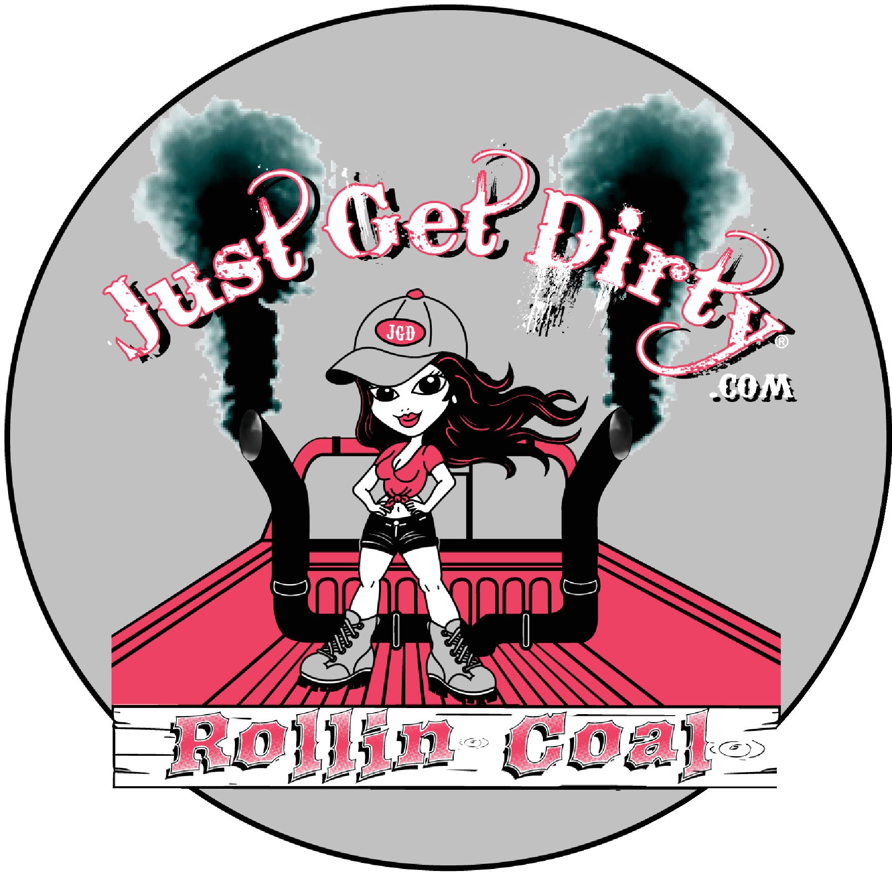 Sticker of cartoon trucker girl in bed of double smoke stack truck, sticker reads "Just Get Dirty" Rollin' Coal Bed of truck is pink and the background is grey. 4.25" x 4.25" are the dimensions of the circular sticker.