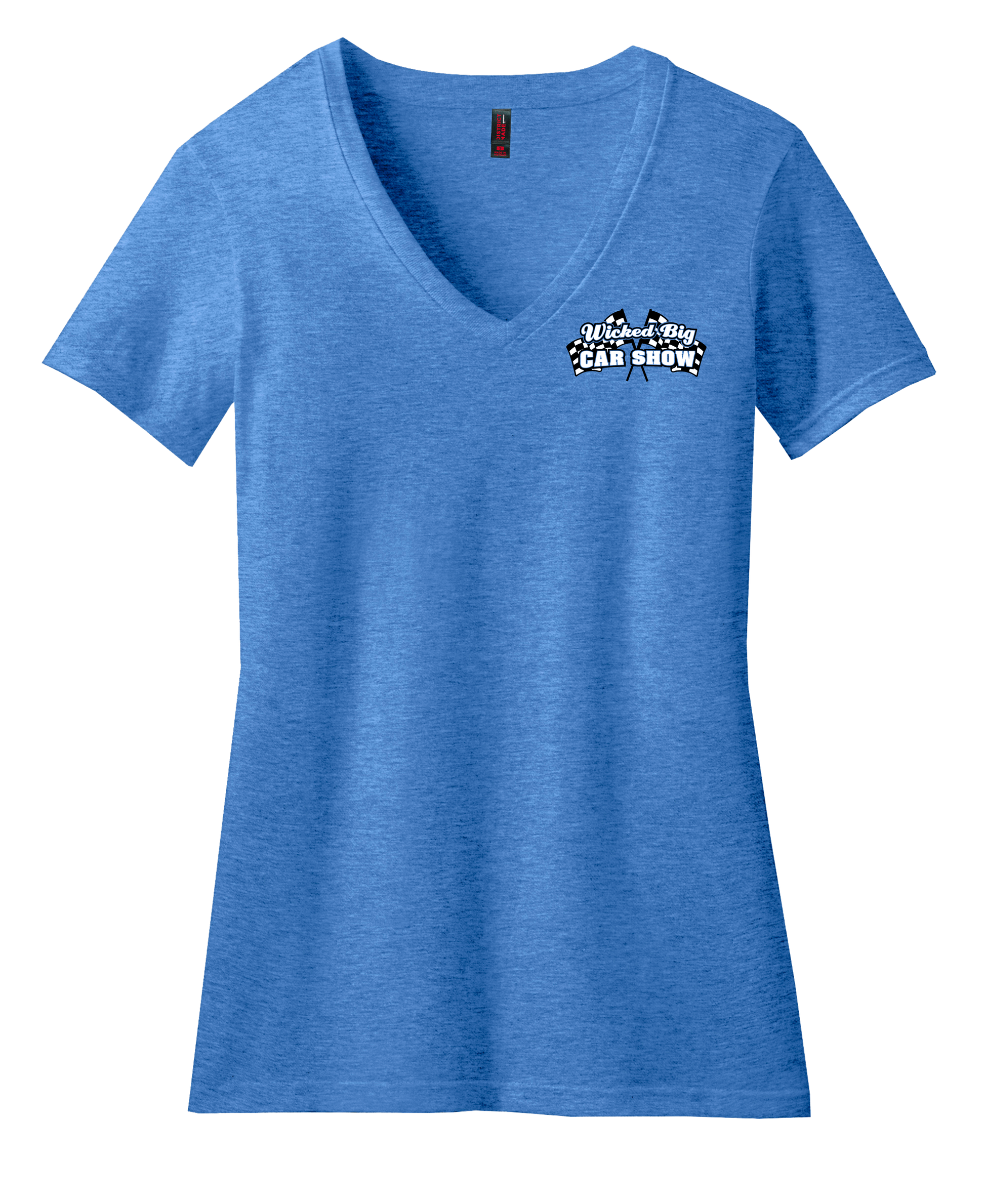 Soft, ladies fit, v-neck style tee, 4.3-ounce, 60/40 combed ring spun cotton/poly tee, FRONT: Wicked Big Car show with crossed checkered flags over the heart. BACK: Wicked Big car Show graphic on back