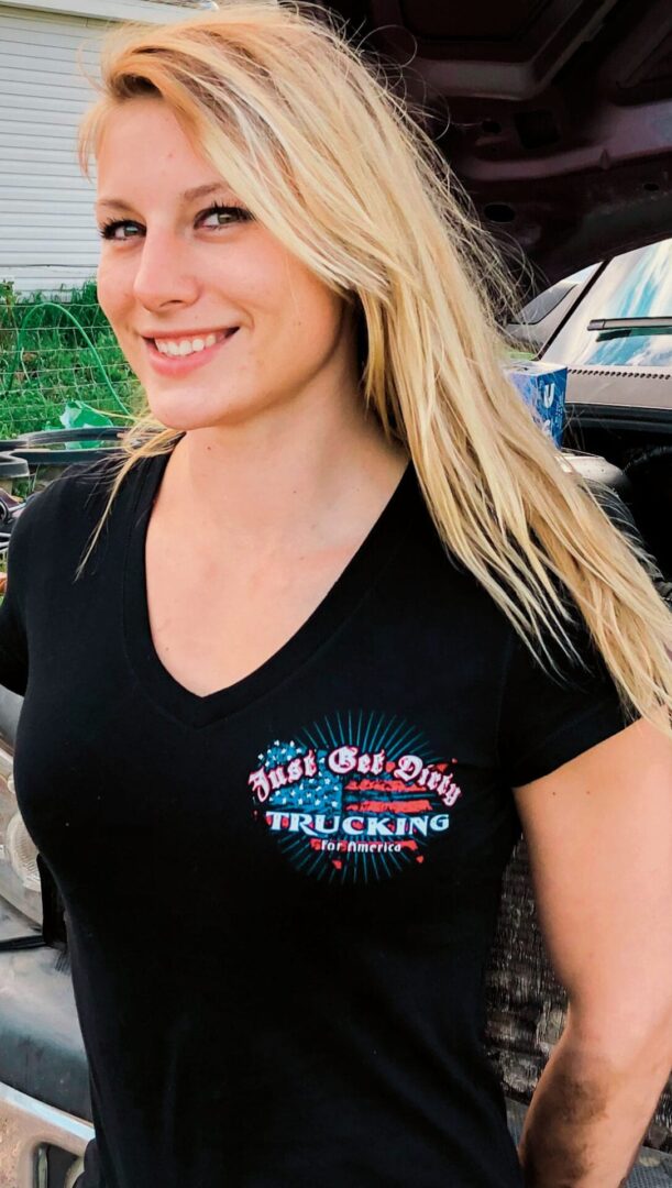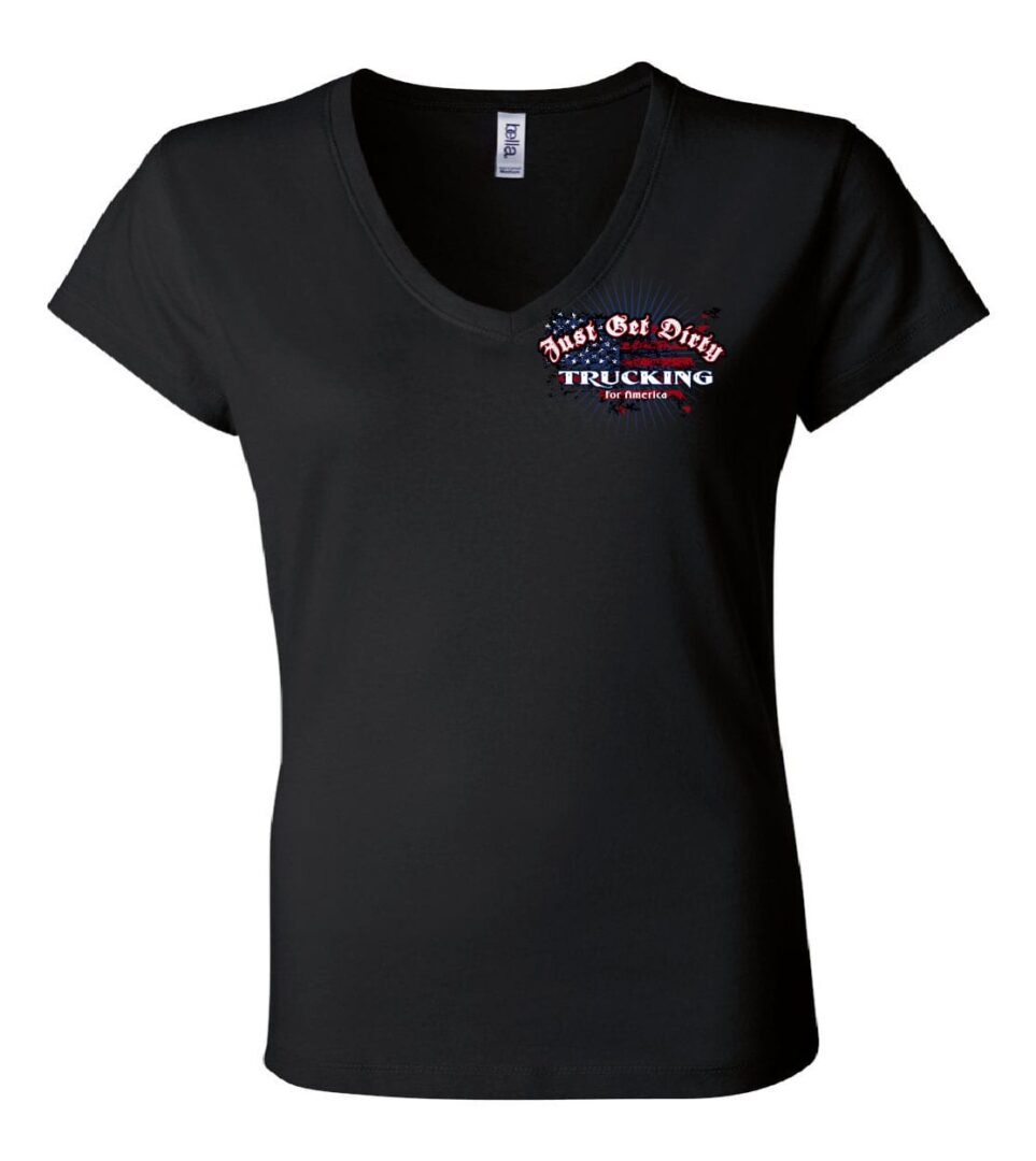 4.2 oz., 100% combed ringspun cotton, junior fitted V-neck tee. Just Get Dirty Trucking for America logo with the American flag graphic over the heart on the front. On the back of the shirt: Just Get Dirty Trucking text with Big Rig graphic with American Flag banner background, with a pinstripe design along the bottom with our motto "If you didn't get dirty, you didn't have fun!" on it. Sizes: S, M, L, XL, 2X & Missy 2X Colors: Black