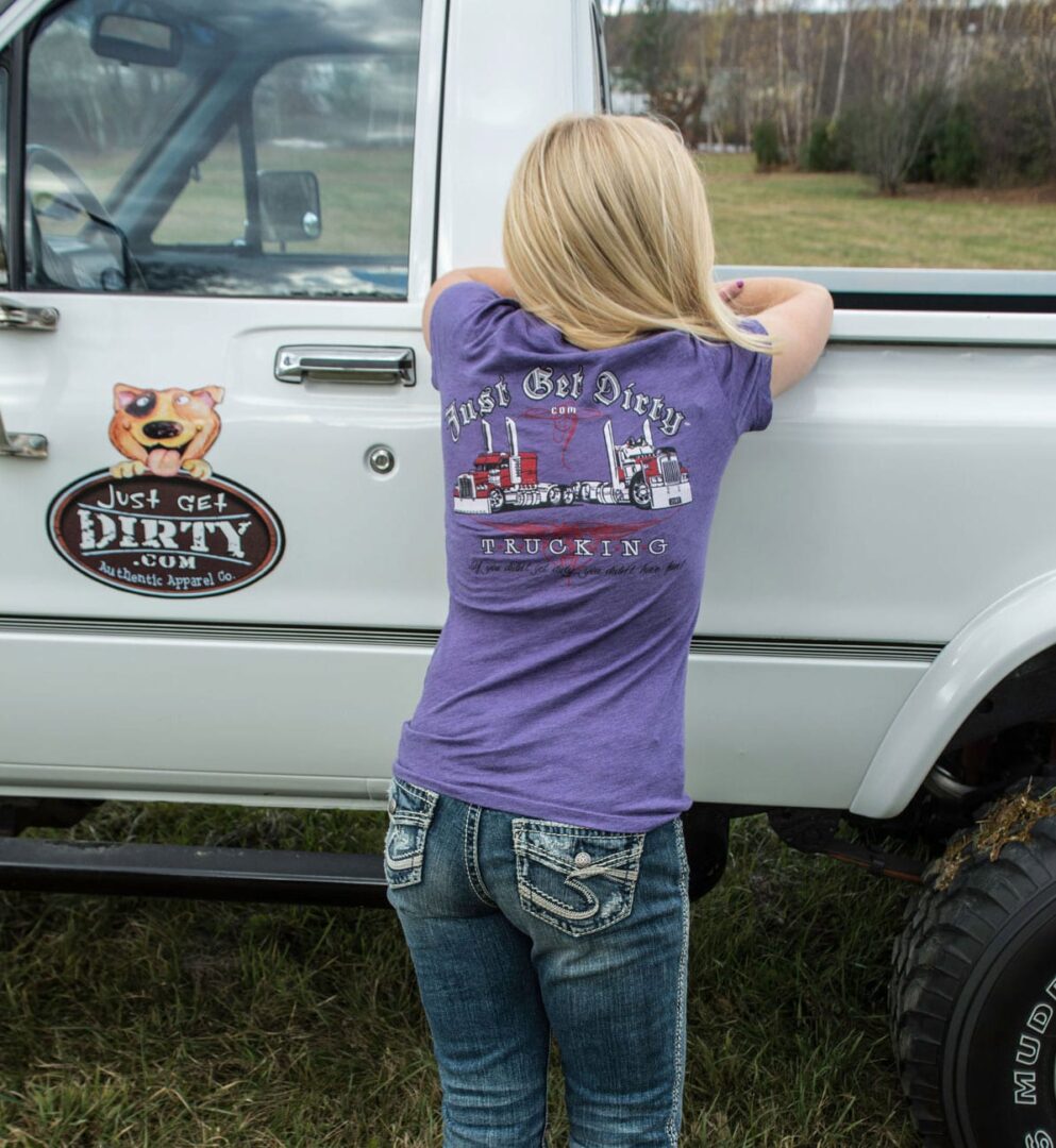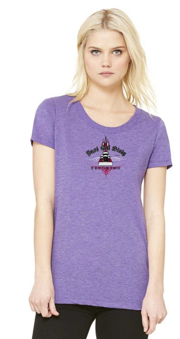 Junior fitted tee. 3.4 oz., 50% polyester, 25% ringspun cotton, 25% rayon. Just Get Dirty Trucking, Big Rig with flames & stacks graphic on front center. On back; Just Get Dirty Trucking, Peterbilt & Kenworth Big Rigs, and pinstripe design along with our motto "If you didn't get dirty, you didn't have fun!" Sizes: S, M, L, XL, 2X Colors: Heather Purple triblend